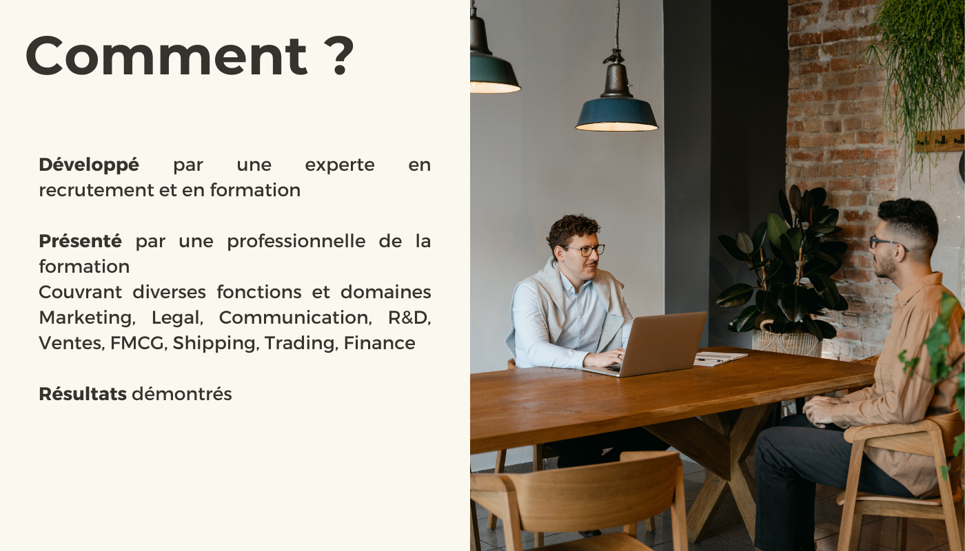J’ai créé recruitAble© qui consiste en une formation en classe sur les fondamentaux du recrutement (CV, Lettre de motivation). Racontez votre CV et IPG (guide de préparation à l’entretien) par le biais d’entretiens individuels pour créer des boîtes à outils personnalisées.