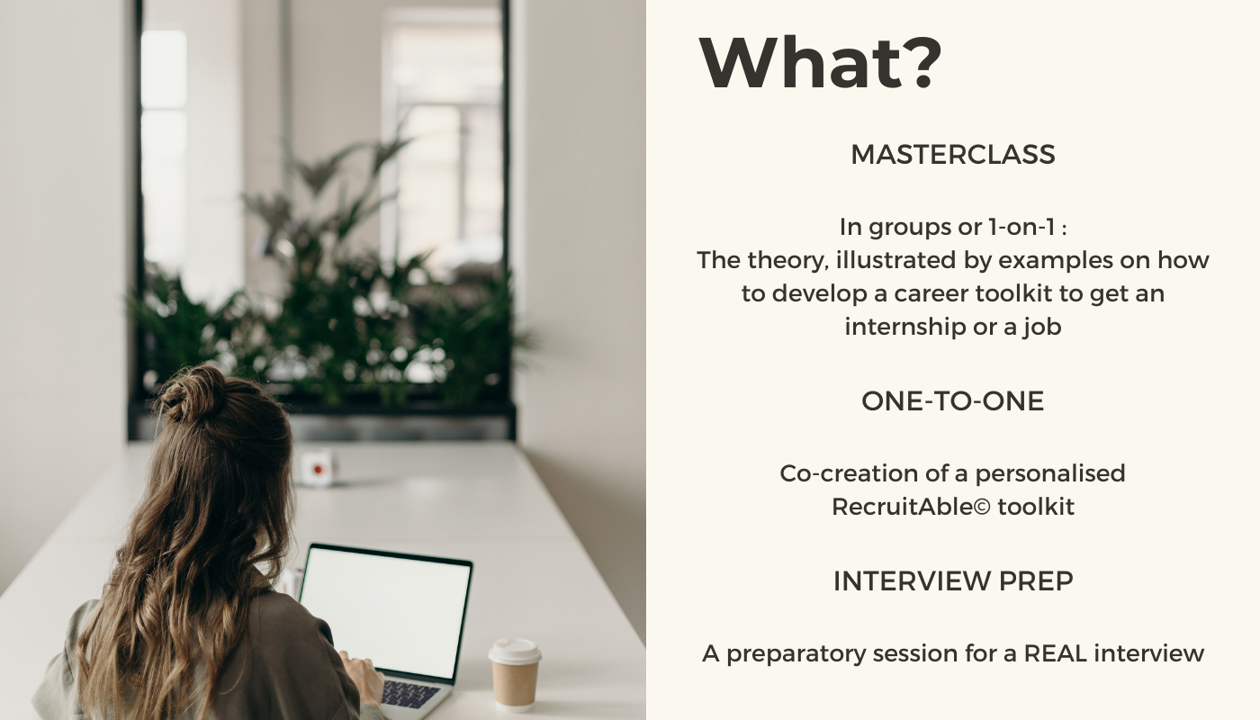 I created recruitAble© that consists in a class training on the fundamentals of recruitment (CV, Cover letter, recruitAble 2min video and IPG (interview Prep guide) and One-to-ones to create personalized toolkits.